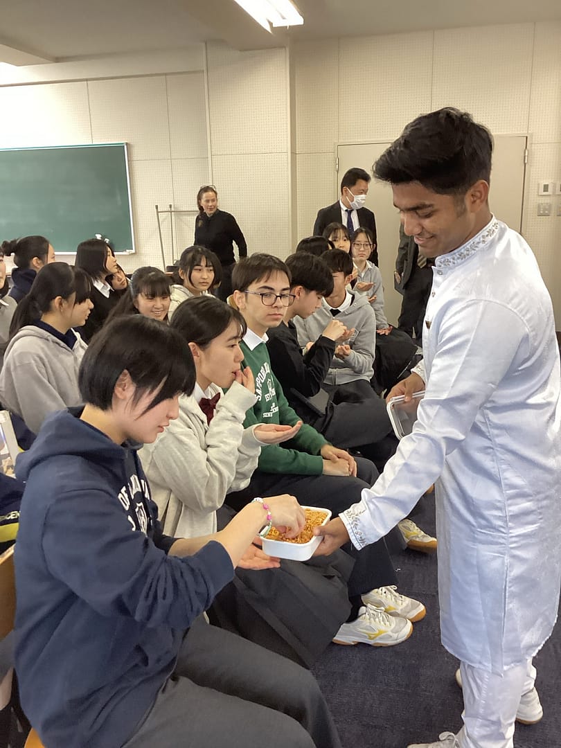 1時間というとても短い時間でしたが、バングラデシュの結婚式やお祭りなど授業でなかなか知る機会のないことについても学ぶことができました。また、お菓子を食べるなど文化や生活に直接触れることができ、とても貴重な体験になりました。